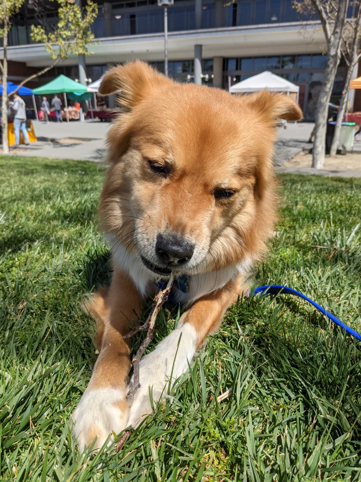 Higgins loves munching on sticks. Even better when there's a farmer's market going on behind him!